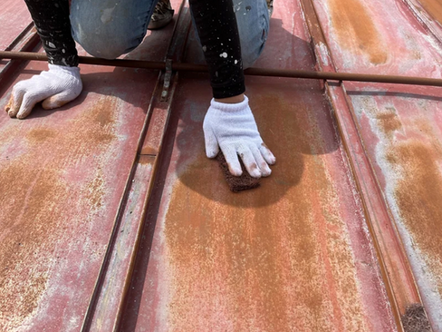 まずは高圧洗浄で汚れをしっかり落とし、ケレン作業にて錆を除去。 下塗りに「ガイナメタルプライマーⅡ」、上塗りに「GAINA(ガイナ)」を使用しました。